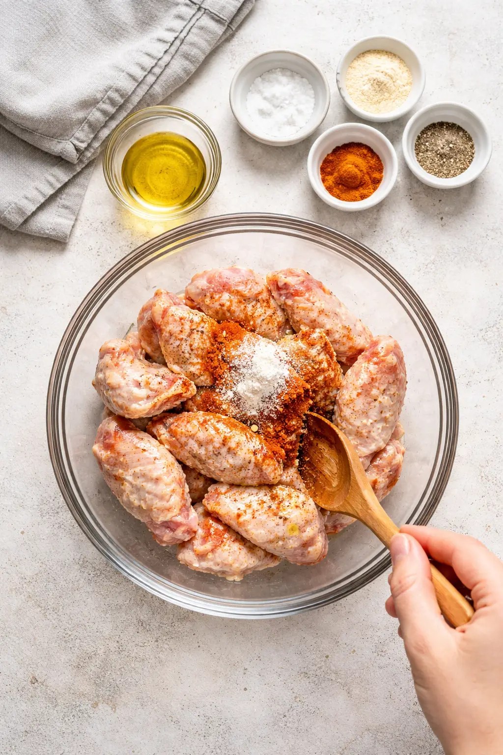 - In a large bowl, toss wings with baking powder, oil, salt, and spices.