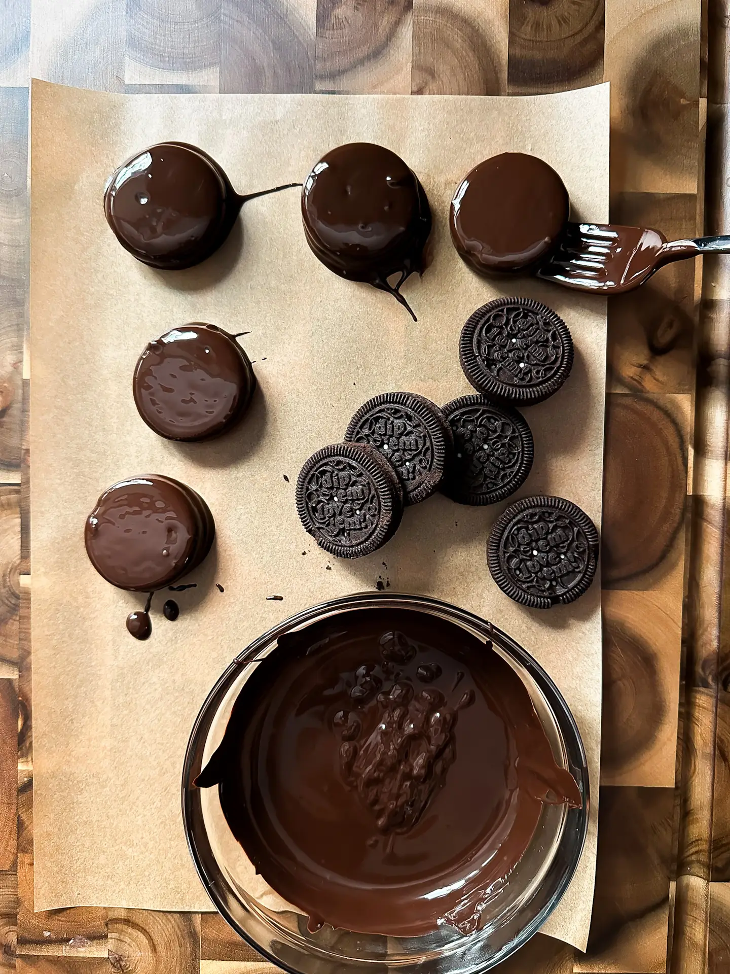 Line a baking pan with parchment paper. Dip each Oreo into the melted chocolate using a fork, letting excess chocolate drip off before placing it on the lined tray.