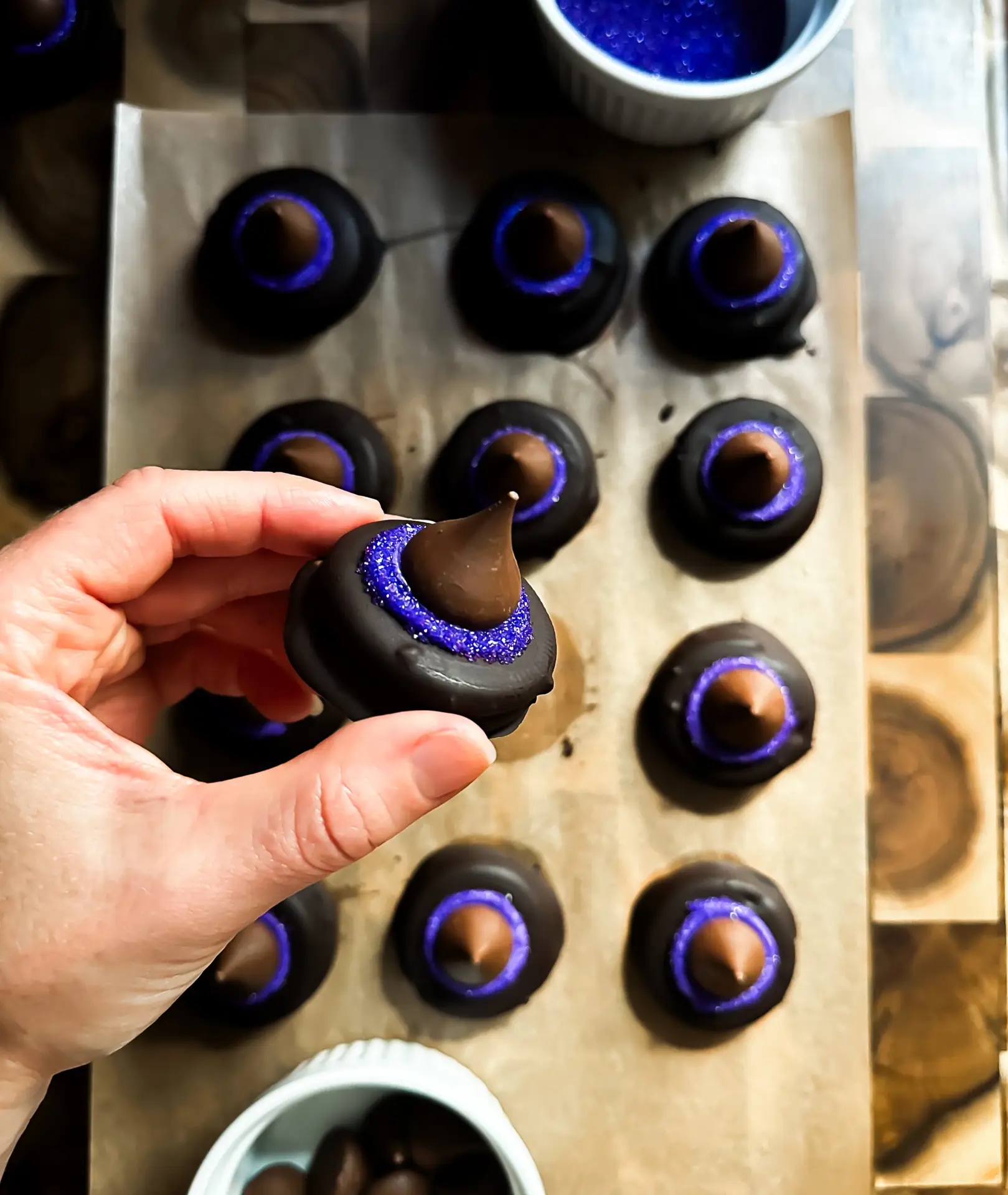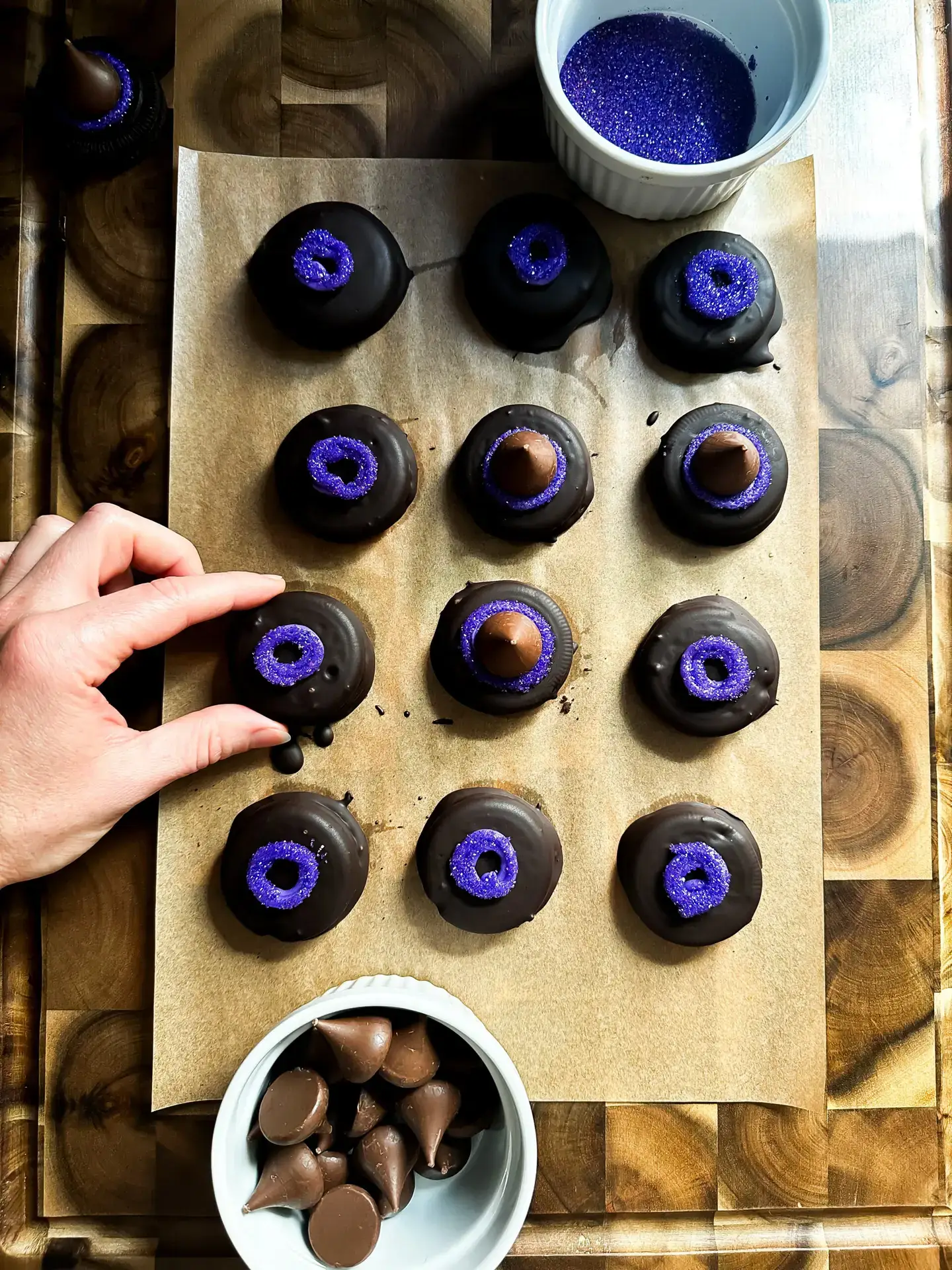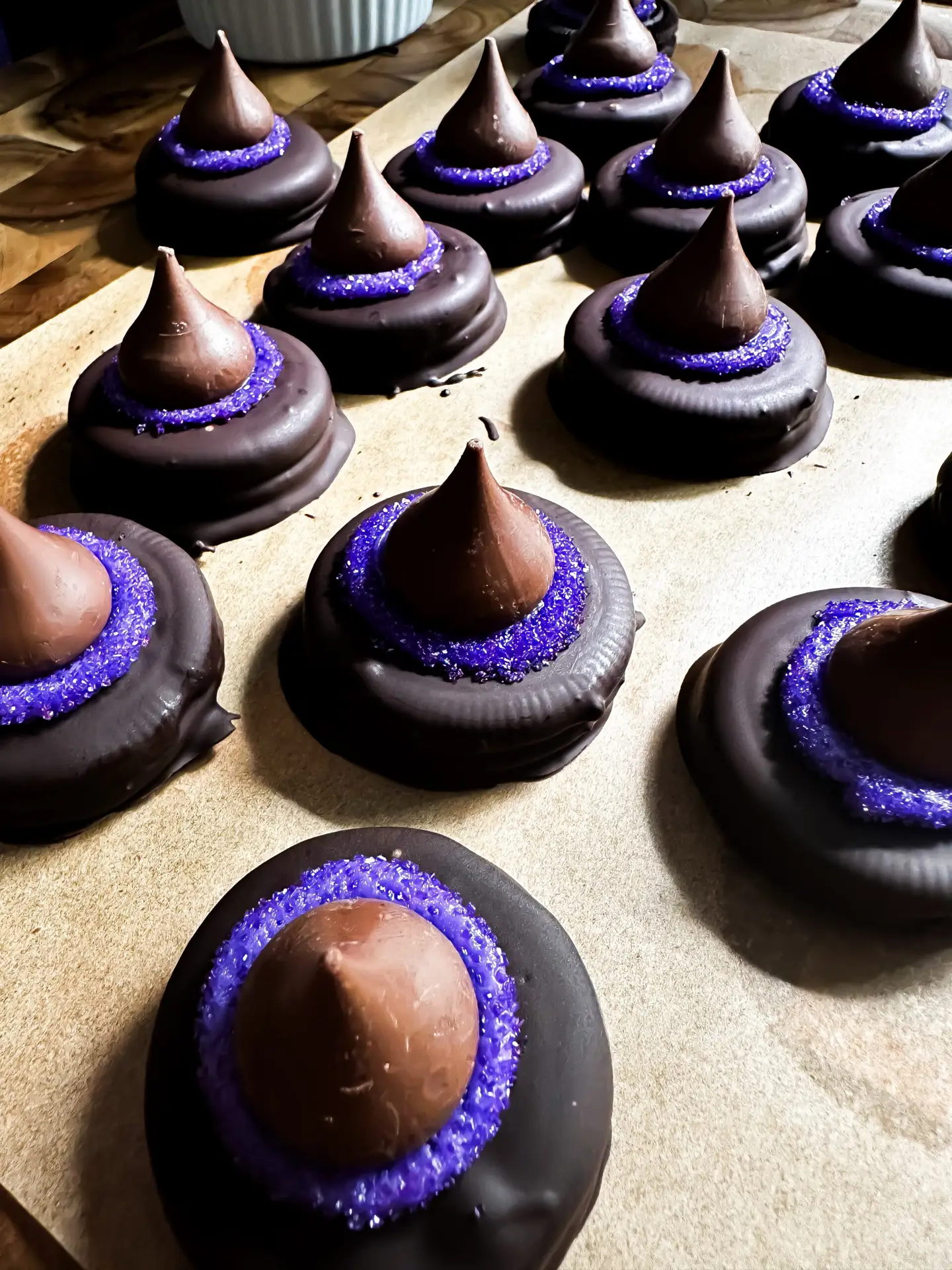 Shortcut Tip: If you’re feeling lazy, short on time, or just want a quick treat, skip the chocolate coating altogether! Simply decorate the top of each Oreo with your purple frosting, add a little shimmer with sprinkles, and finish with a Hershey’s Kiss. You’ll still get that festive witch hat look without waiting for the chocolate to set — perfect for last-minute parties, classroom snacks, or when you need a fun Halloween dessert in a flash.