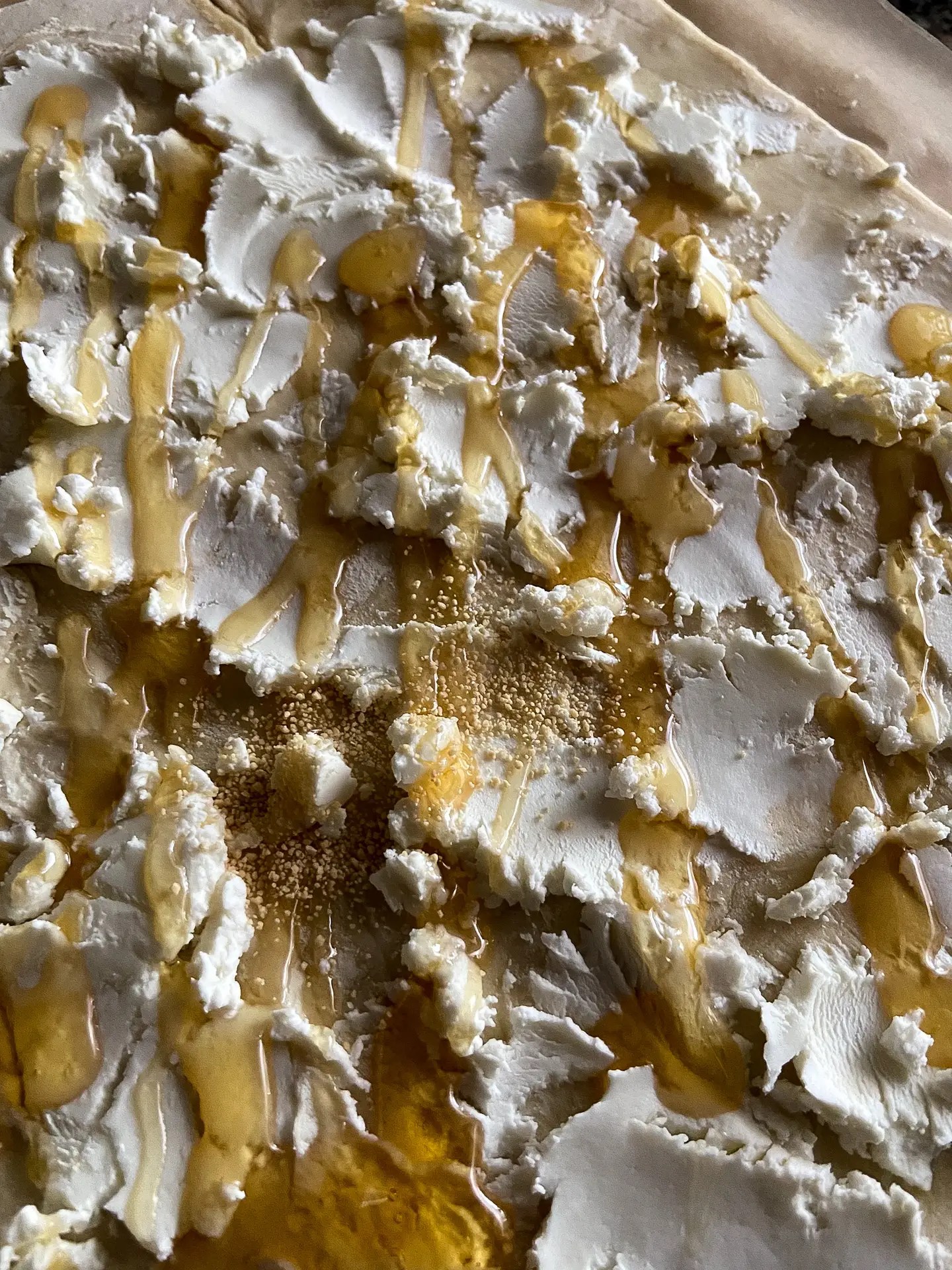 - Lather on goat cheese as you see above, then drizzle your honey, sprinkle on your crystals, and finish with your pecans or walnut pieces.